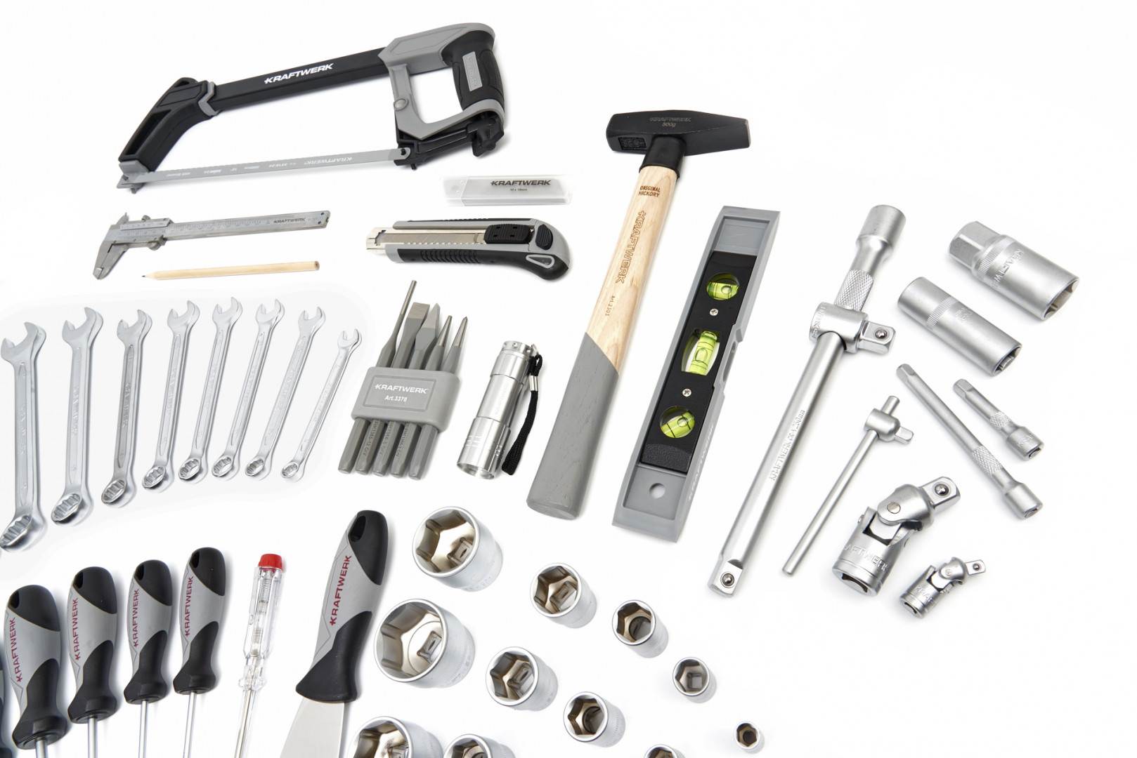 | 1/2 Zoll Set | Sechskantbuchsen 10 - 13 - 14 - 15 - 16 - 17 - 18 - 19 - 20 - 21 - 22 - 24 - 27 - 30 - 32 mm Zündkerzenkappen: 16 - 21 mm Gelenkschlüssel Verlängerungsstück 250 mm 3/8 "bis 1/2" Adapter 45-Zahn-Umkehrratsche Bit Sortiment 27 Stück Ring-Pitch-Tasten: 8 - 10 - 11 - 12 - 13 - 14 - 17 - 19 - 22 mm Einstellbarer Schraubenschlüssel 250 mm Länge Sägeschraubendreher 3,0 x 75 - 4,0 x 100 - 5,0 x 100 - 6,0 x 150 mm Kreuzschlitzschraubendreher PH1x75 - PH2x100 mm Torx®-Schraubendreher T15x75 - T20x100 - T25x100 - T30x150 mm Spannungsprüfer 110 - 250 V. Sechskantschlüsselsatz 1,5 - 2 - 2,5 - 3 - 4 - 5 - 6 - 8 - 10 mm Kombizange 180 mm Seitenschneidezange 160 mm Spitzzange 200 mm Rohrschlüssel 250 mm Zange 200 mm Drahtisolier- und Crimpwerkzeug 225 mm Drahtschneider 185 mm Tischhammer 300 g Universeller Sägerahmen 300 mm Universal-Abreißmesser 18 mm mit Ersatzklingen Handfeile, flach 320 mm 6-teiliges Kontaktdateiset 160 mm Teleskopmagnet 130 bis 640 mm, Kapazität 1600 Gramm Bleistift LED-Taschenlampe Wasserwaage 225 mm Maßband 5 m Messschieber 150 mm Edelstahlschaber 40 mm Drift-Set, 5 Stück 50-teiliges Flachstecker- / Kabelschuhset |