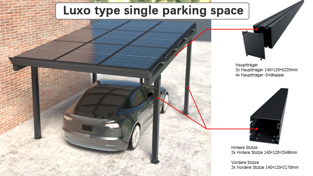 Ihr Parkplatz wird zum Stromproduzent - Das Modell LUXO Solarcarport mit 9 Solarpanels – Ein Carport zwei Zwecke: Parken & Strom erzeugen!
