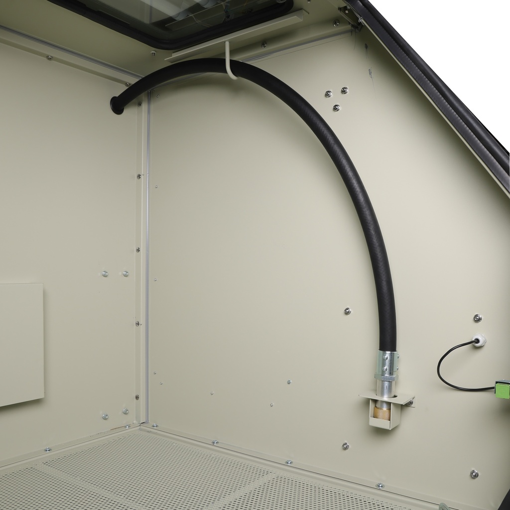 Die Strahlkabine verfügt über ein Kabinenvolumen von 990 Litern und eine große Frontklappe für den Zugang zum Arbeitsbereich. Die serienmäßige zweistufige Staubabsaugung besteht aus einem Zyklon als Vorfilter und einem Cartridge Hauptfilter (Micron). Größere Partikel werden zunächst durch den Zyklon abgeschieden, anschließend filtert das Cartridge Filter Feinstaub bis etwa 8 µm. Dies sorgt für gute Sicht in der Strahlkabine und reduziert Verstopfungen sowie Strahlmittelverlust.
