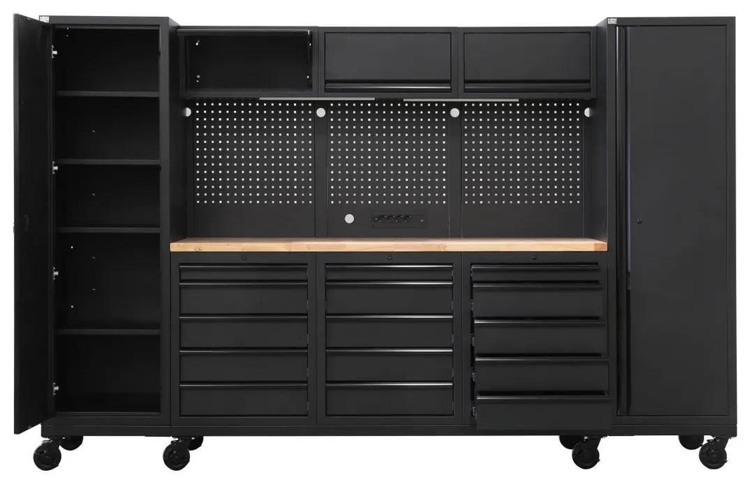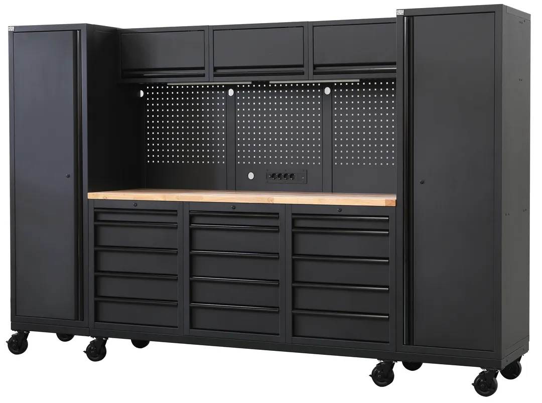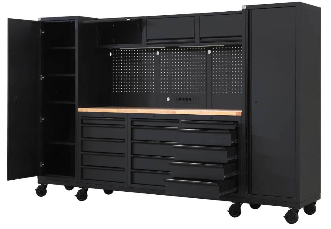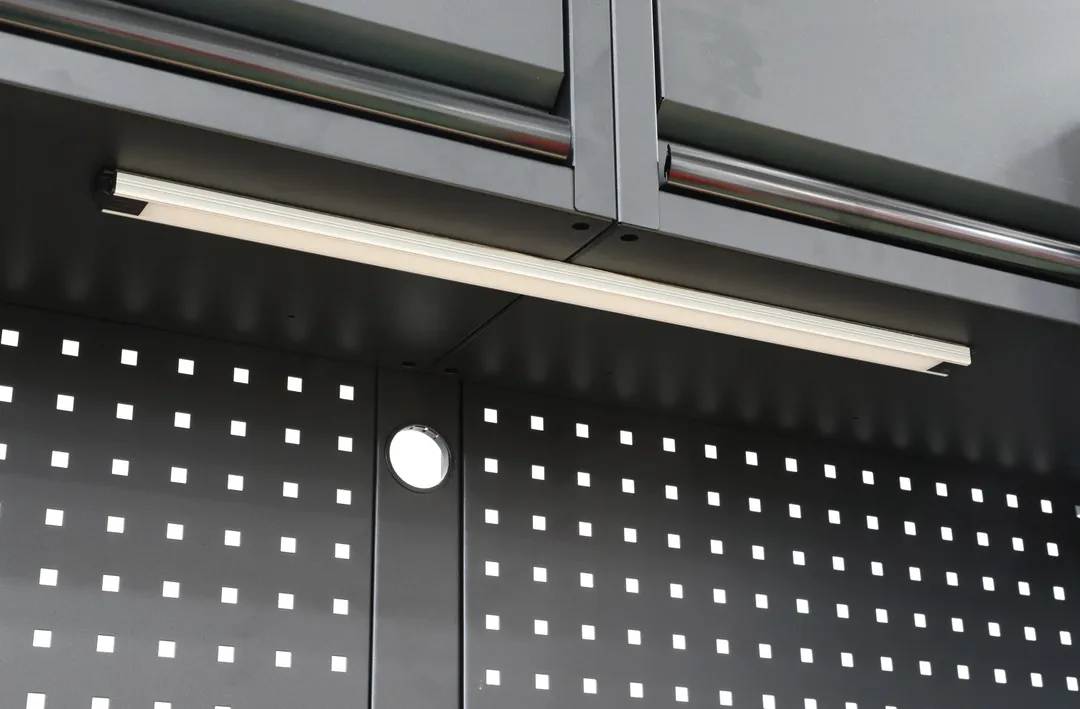 Das 12-teilige Werkstattsystem ist mit mehreren geräumigen Schubladenschränken, hohen Aufbewahrungsschränken und Oberschränken ausgestattet, mit einer stabilen Arbeitsplatte in der Mitte. Die gelochte Rückwand ermöglicht ein übersichtliches Aufhängen von Werkzeugen; außerdem ist die Rückwand mit einer integrierten Steckdosenleiste inklusive USB-A- und USB-C-Anschluss ausgestattet. So können auch Elektrowerkzeuge oder Ladegeräte angeschlossen werden. Dank der stabilen Lenkrollen lässt sich das System einfach bewegen.