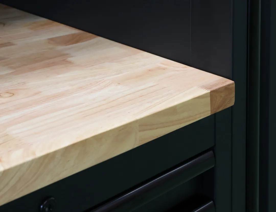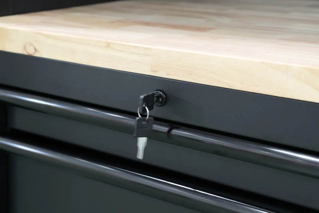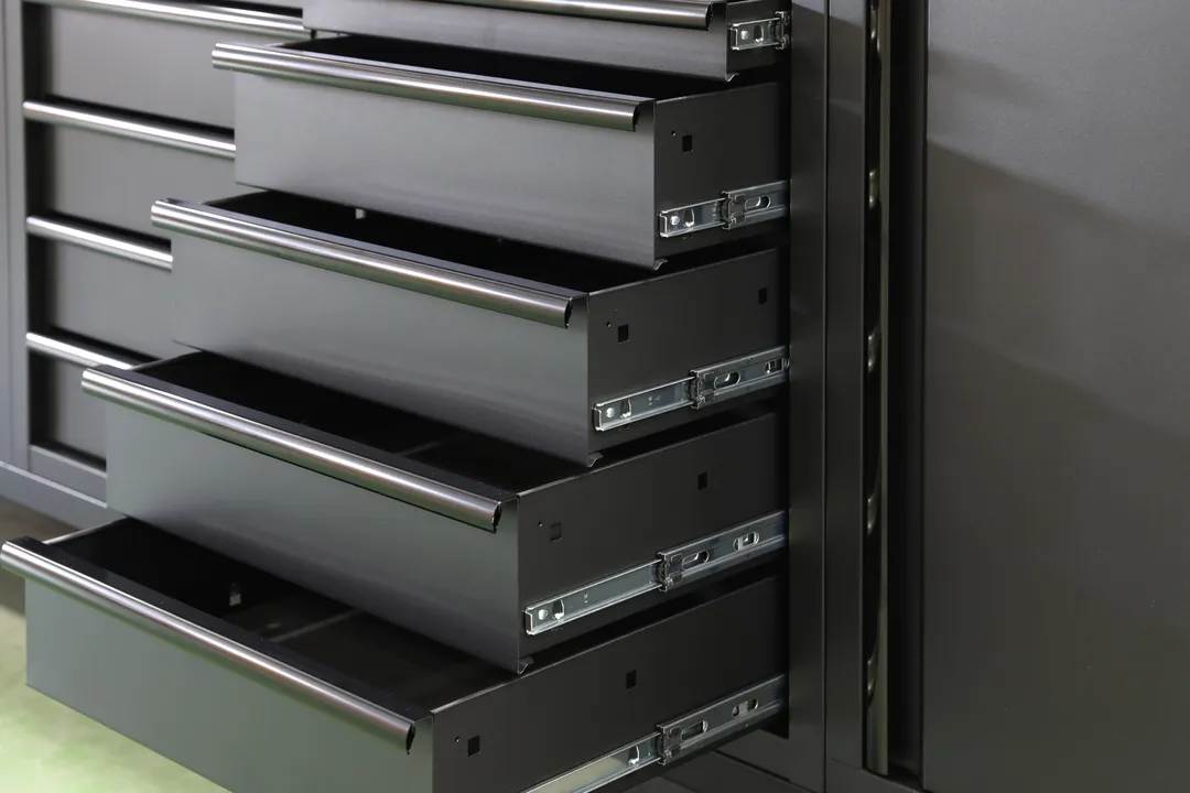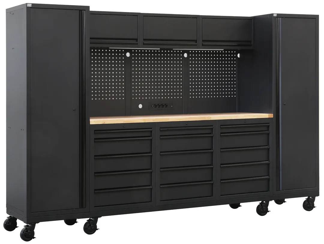 Das 12-teilige Werkstattsystem ist mit mehreren geräumigen Schubladenschränken, hohen Aufbewahrungsschränken und Oberschränken ausgestattet, mit einer stabilen Arbeitsplatte in der Mitte. Die gelochte Rückwand ermöglicht ein übersichtliches Aufhängen von Werkzeugen; außerdem ist die Rückwand mit einer integrierten Steckdosenleiste inklusive USB-A- und USB-C-Anschluss ausgestattet. So können auch Elektrowerkzeuge oder Ladegeräte angeschlossen werden. Dank der stabilen Lenkrollen lässt sich das System einfach bewegen.