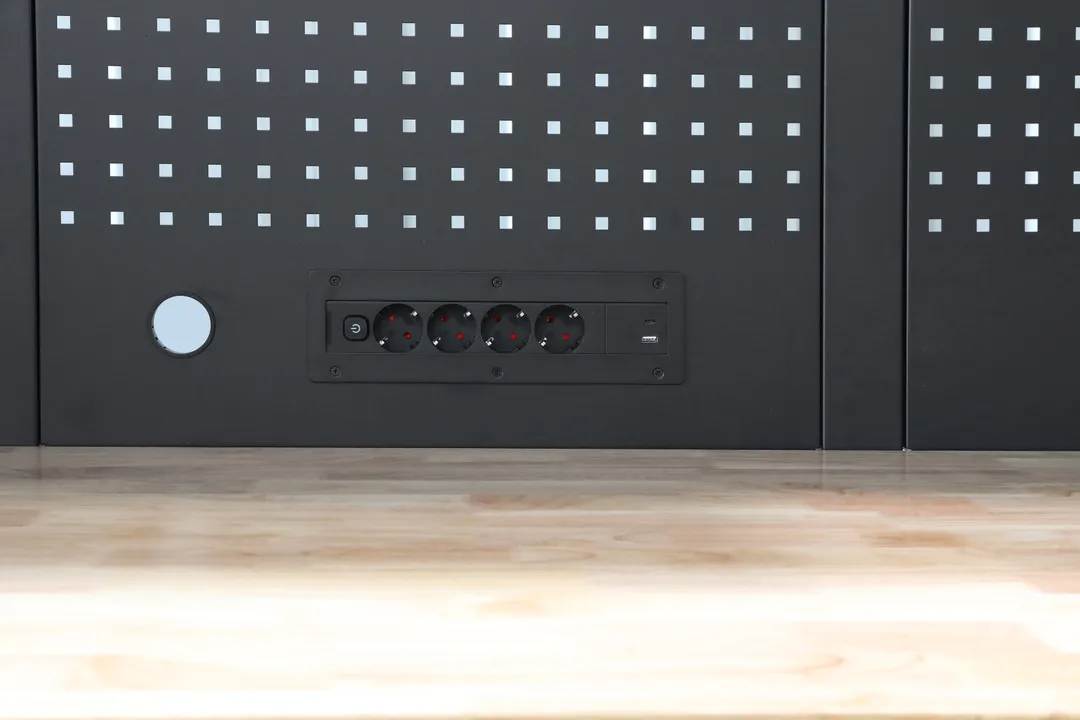 - Integrierte Steckdosenleiste inklusive USB-A- und USB-C-Anschlüsse