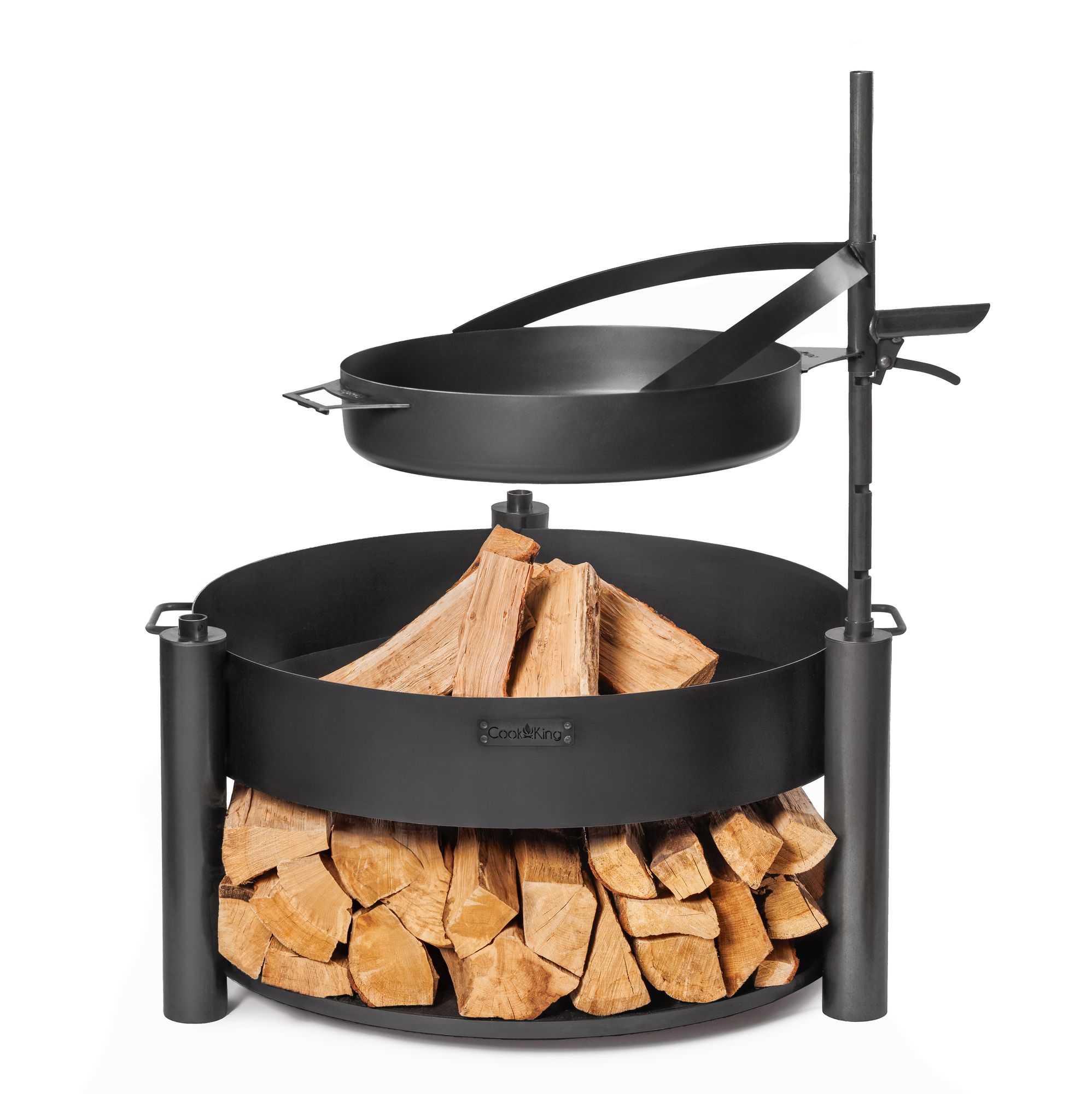 Diese Feuerschale ist mit zwei vertikalen Masten ausgestattet, die direkt in den Beinen der Feuerschale montiert werden. Die Masten dienen als Basis für die Montage von Grillzubehör und ermöglichen dessen Anbringung in beliebiger Höhe, wodurch eine präzise Kontrolle des Garprozesses gewährleistet wird. Zum Set gehören ein 60 cm großes Grillrost, das um 160 Grad gedreht werden kann, sowie eine tiefe Pfanne mit einem Durchmesser von 50 cm. Diese Zubehörteile ermöglichen die Zubereitung großer Portionen und eignen sich ideal für das Kochen für mehreren Personen. Der in den Masten eingesetzte Rastmechanismus erlaubt die präzise Einstellung sowohl des Grillrosts als auch der Pfanne auf die gewünschte Höhe und bietet somit volle Kontrolle über die Grill- und Brattemperatur.