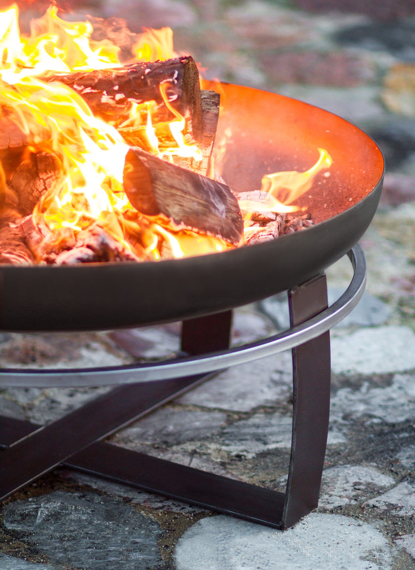 Die Form der Feuerschale verhindert einen Funkenflug, bei starkem Wind, durch das brennende Holz.