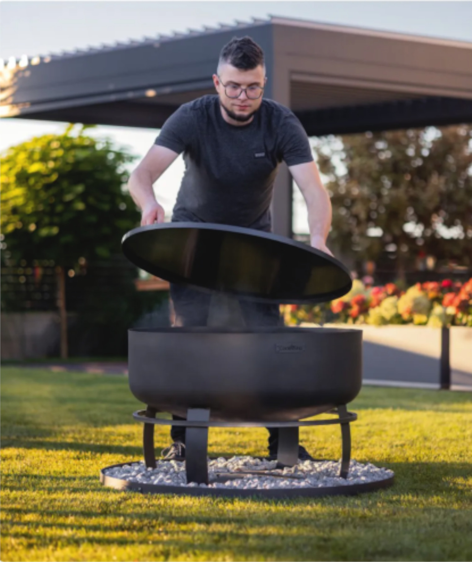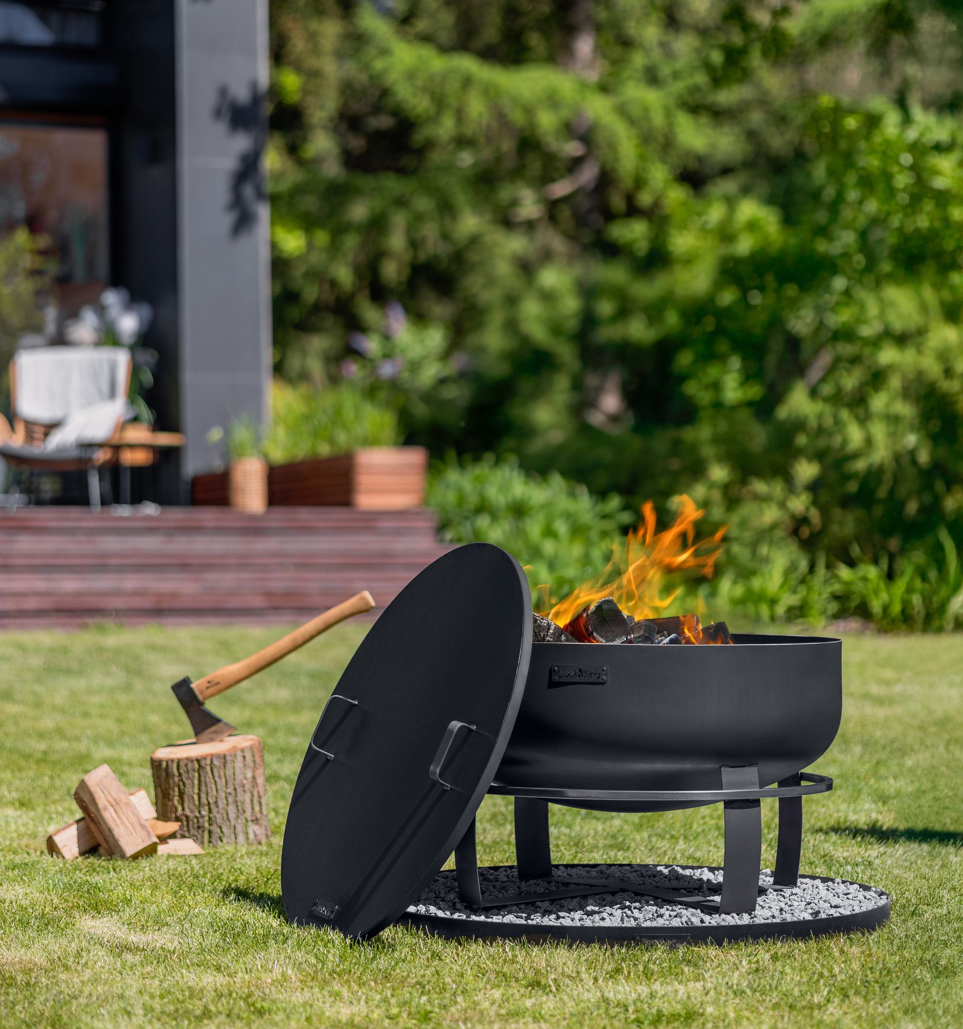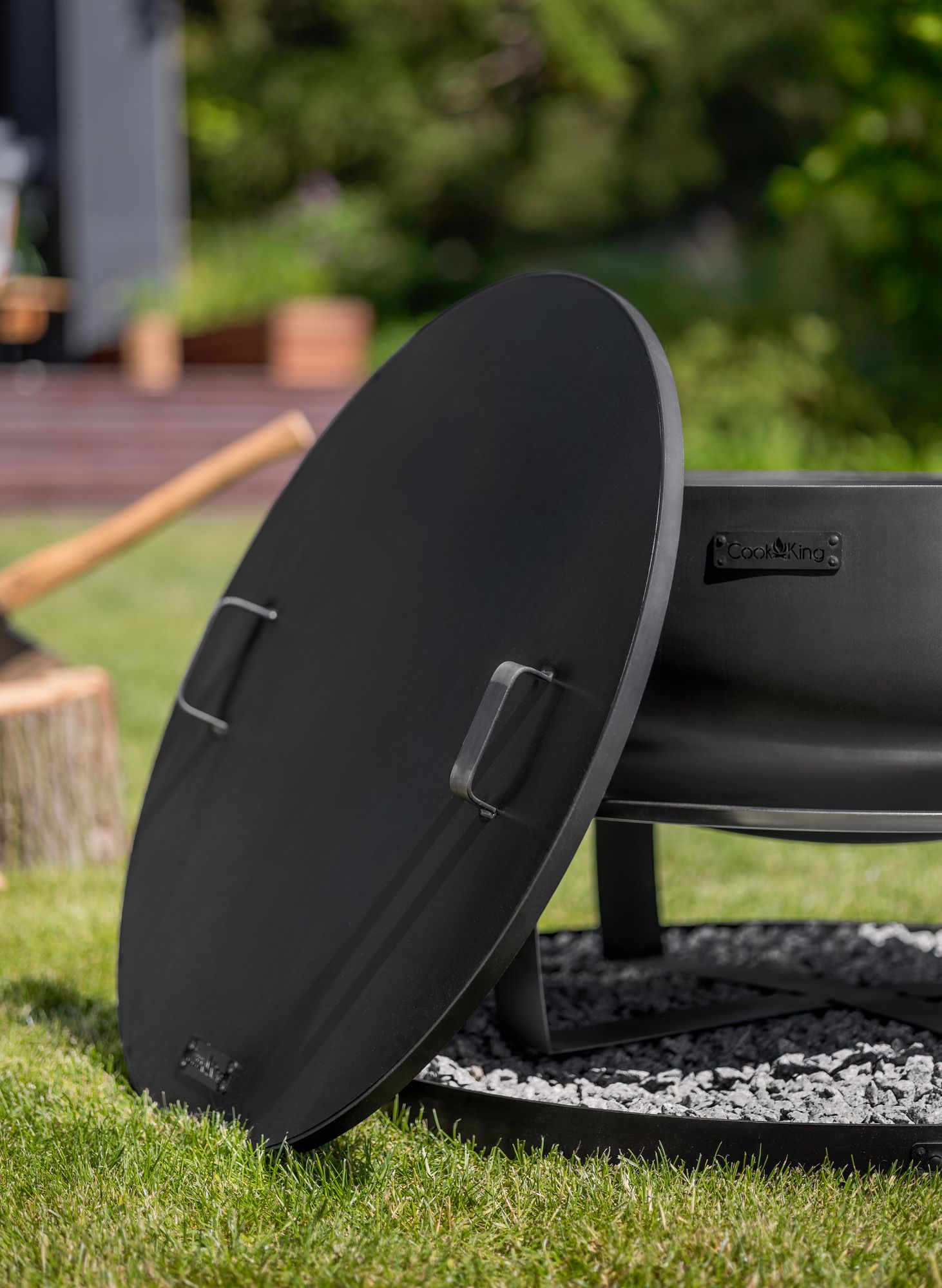 Grillabend an der Feuerschale „VIKING“ 80 cm mit Randdeckel 81,5 cm und einer runden Deko-Steinbasis 100cm