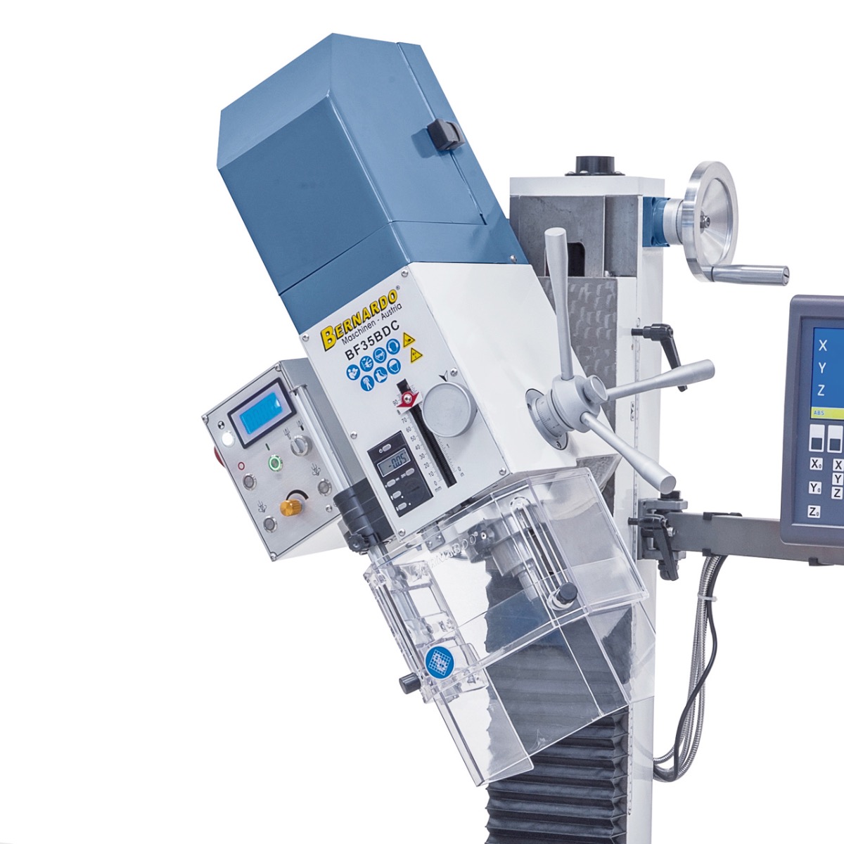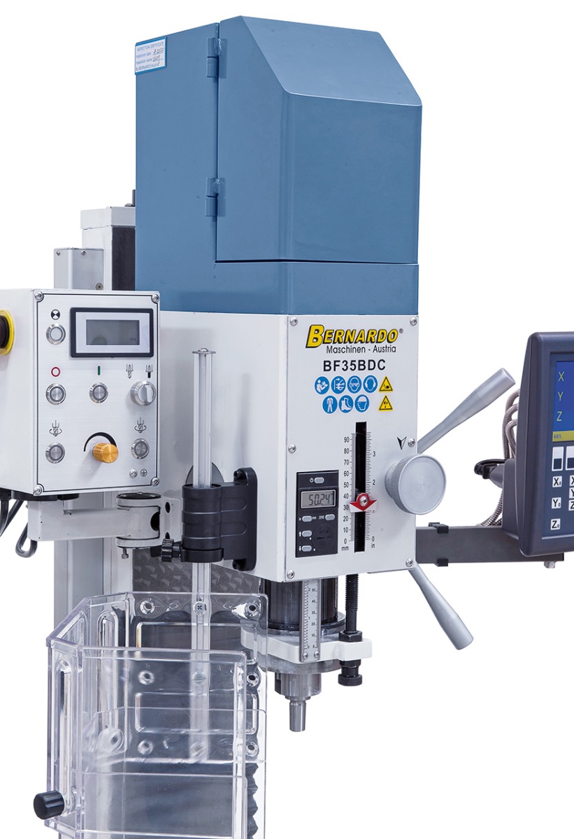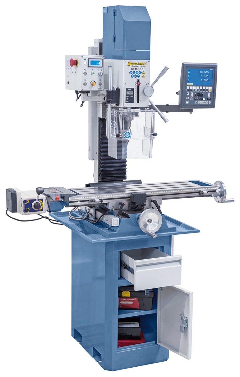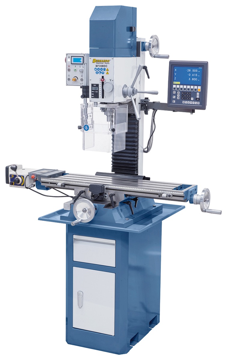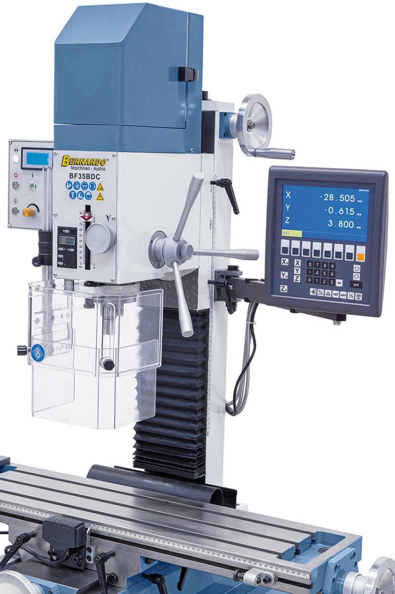 Diese Bernardo Fräsmaschine kann für vielseitige Möglichkeiten wie Planfräsen, Ausspindeln, Schlitzfräsen angewendet werden. Die Bohr- und Fräsmaschine ist aufgrund der hohen Drehzahl von 3000 U/min und dem leistungsstarkem Antriebsmotor das ideale Modell für Fräsarbeiten des anspruchsvollen Anwenders. Die digitale Tiefenmessung hilft dabei, genau abzulesen, wie tief die Fräsleistung fortgeschritten ist. Die Maschine kann einfach in der Werkstatt aufgestellt und installiert werden. Das zweite Modell (BN-02-1117) ist mit einer Digitalanzeige und einem stufenlos regelbaren Frästischvorschub ausgestattet. Mit dem dreiachsigen Digitalanzeigesystem können Sie die Fertigungszeiten Ihrer Arbeit stark reduzieren. Mit der hochwertigen LCD Anzeige können Sie alle Werte genau ablesen.