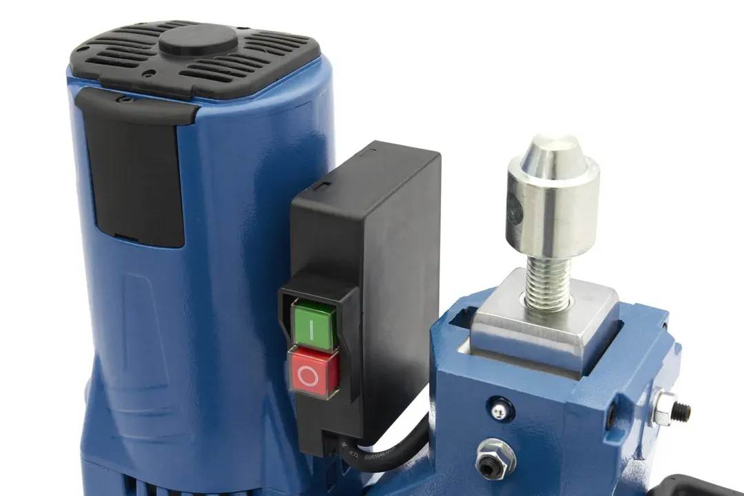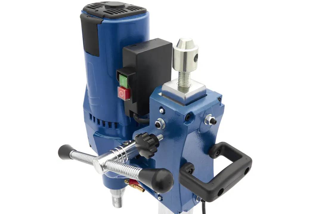 Der zentrale Teil des Bohrers besteht aus einem Metallrohr, über das der Bohrkopf gleitet. Auf diese Weise können Sie die Arbeitshöhe des Bohrers je nach dem zu bohrenden Objekt schnell einstellen. Sie befestigen den Bohrer mit Hilfe von verschiedenen Schrauben durch die Löcher im Stahlsockel fest auf der zu bearbeitenden Fläche. Der Sockel ist breit und stabil, so dass die Maschine sich nicht bewegen kann. Bei der Nutzung bedienen Sie die Bohrmaschine mit einem langen Griff an der Seite der Maschine. Auf diese Weise haben Sie immer die Kontrolle über die Bewegungen des Bohrkopfs.