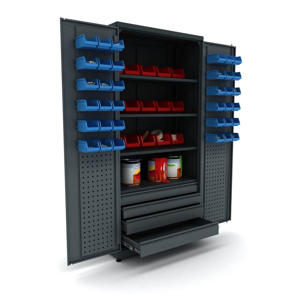 | Austattung | Perforierte Platten in den Türen Inklusive 4 Schubladen mit kugelgelagerten Schienen Enthält 15 große und 36 kleine Fächer 4 verstellbare Einlegeböden |