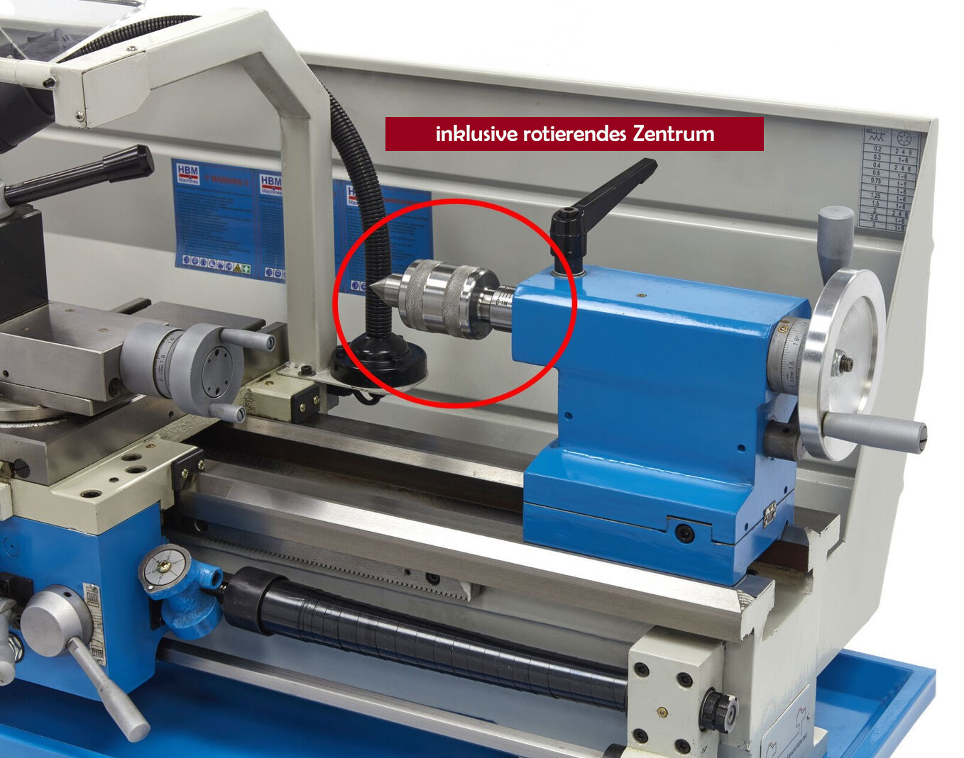 Der Querschlitten mit klappbarer Schutzabdeckung ist zusätzlich mit einem Oberwagen (Konusschlitten) mit einer Winkelverstellung zum Drehen konischer Flächen ausgestattet. Der Morsekegel MK3 der Spindel der Pinole garantiert eine perfekte Zentrierung und einen festen Sitz von allem, was in ihn eingesetzt wird (Bohrkopf / rotierendes Zentrum). Die Hauptspindel hat einen Durchmesser von 38mm und eine MK5 Halterung.