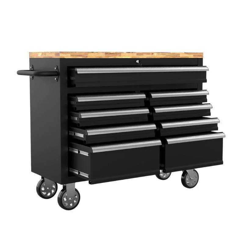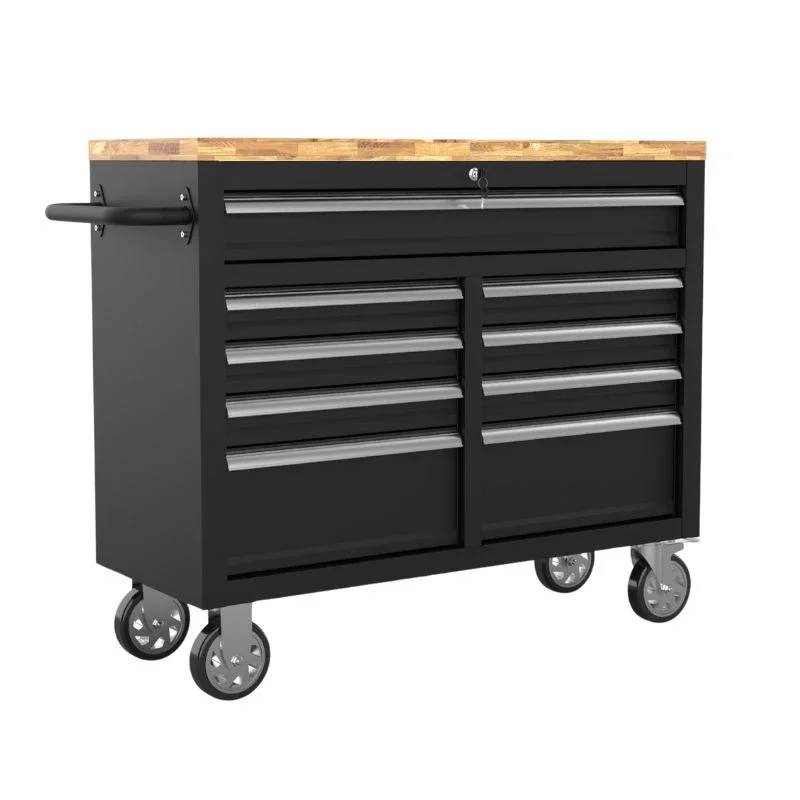 Stabiler Werkstattwagen mit 11 leichtgängigen Schubladen und massiver Holz-Arbeitsplatte. Der Wagen bietet viel Stauraum für Werkzeuge und Zubehör und lässt sich dank Schwerlastrollen flexibel in der Werkstatt bewegen.