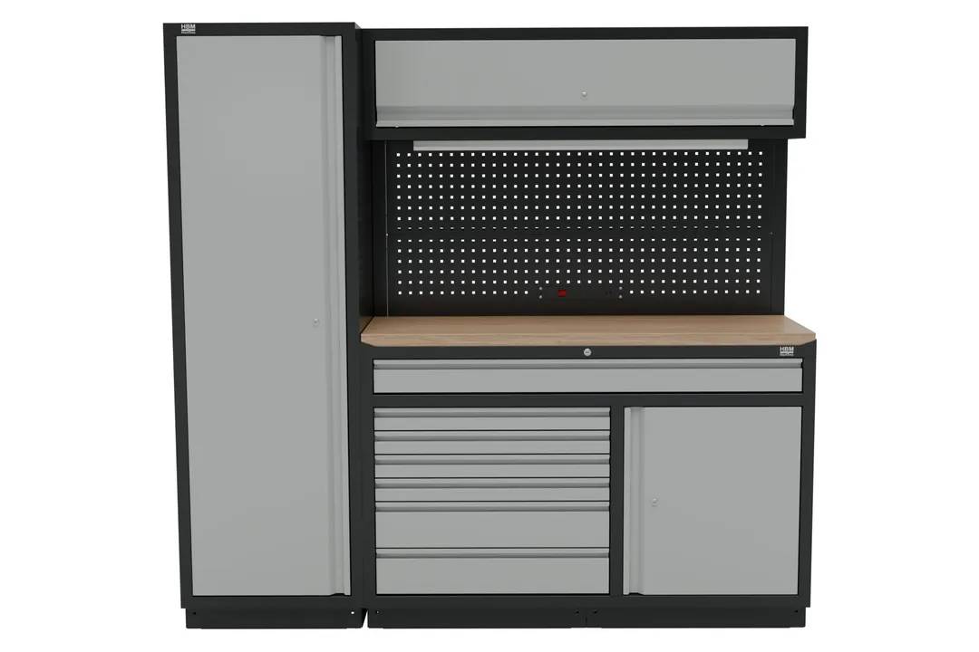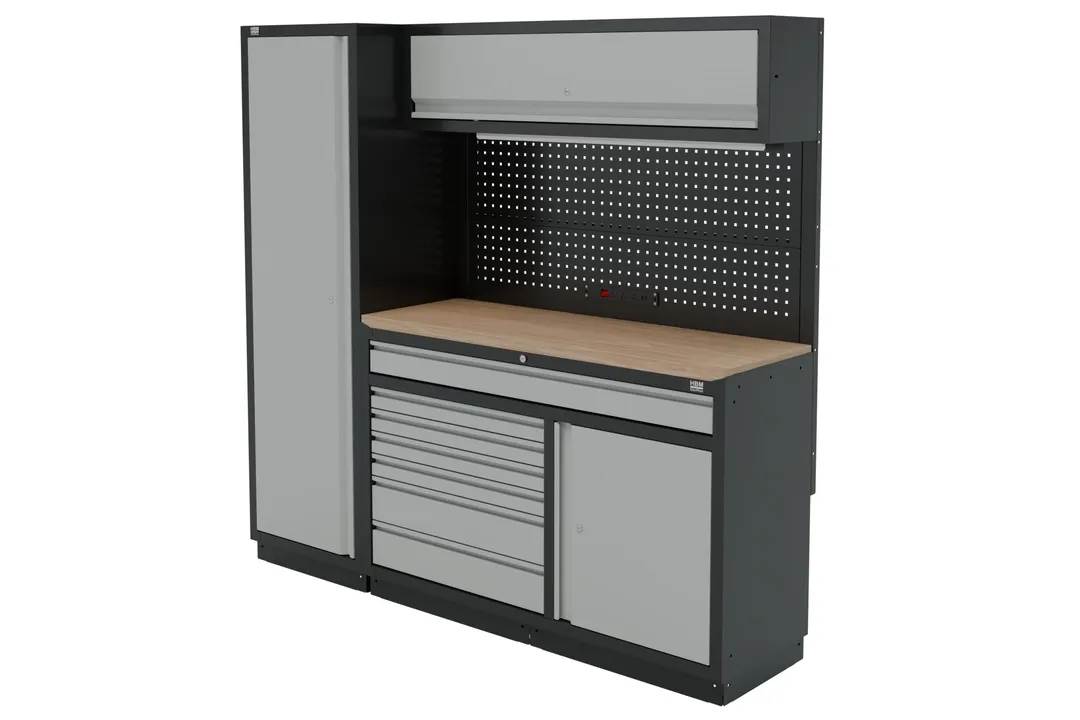 Das 6-teilige modulare Werkstattset in Schwarz und Grau ist die ideale Lösung für eine gut organisierte und effiziente Arbeitsumgebung. Es bietet großzügigen Stauraum mit einem hohen Schrank, einem Schubladenblock und einem Aufbewahrungsschrank, sodass Werkzeuge und Zubehör jederzeit ordentlich verstaut sind. Der Schubladenblock verfügt über eine extra breite Schublade (137,2 cm), die sich perfekt für größere Werkzeuge eignet. Eine integrierte Steckdosenleiste erleichtert den Anschluss von Elektrowerkzeugen, während die LED-Beleuchtung für optimale Sicht sorgt. Die robuste Holzarbeitsplatte bietet zudem eine langlebige und stabile Arbeitsfläche.