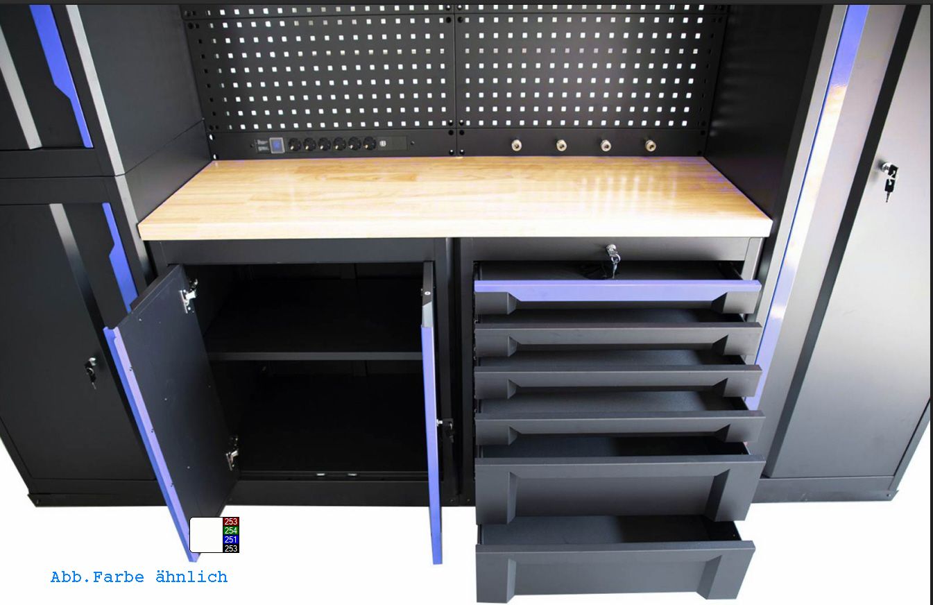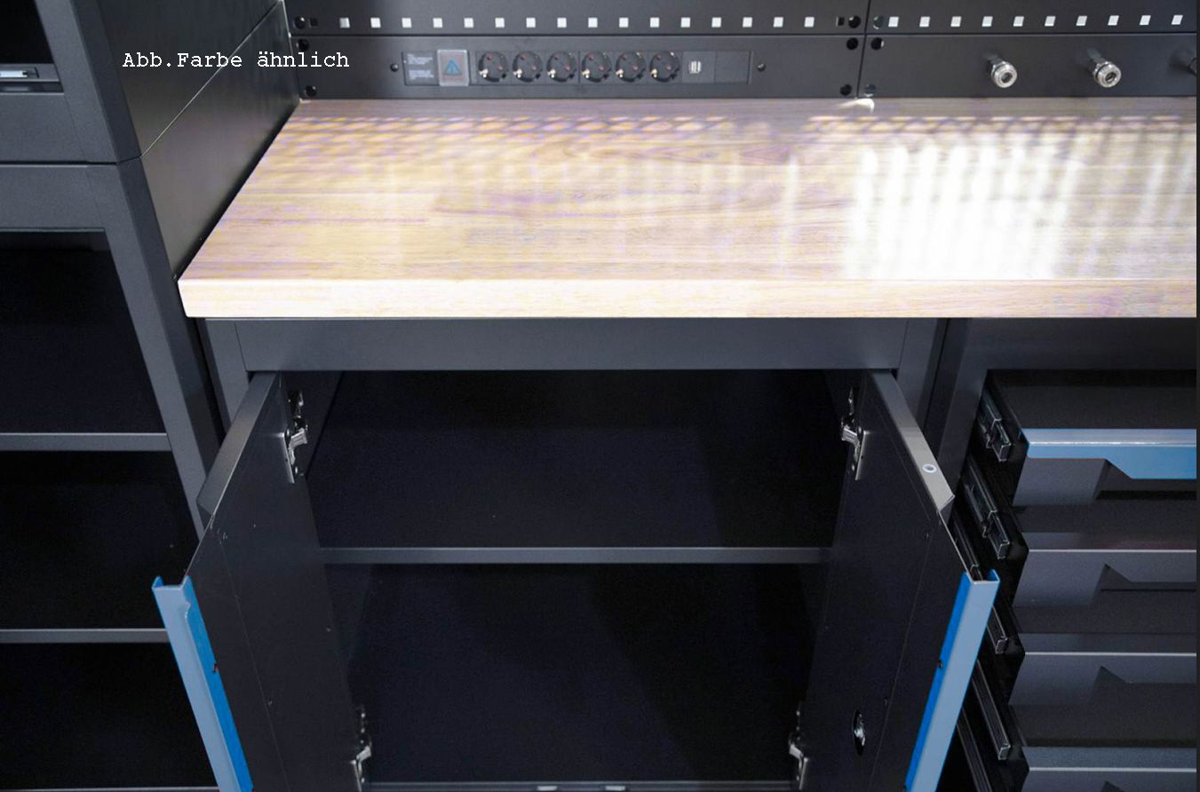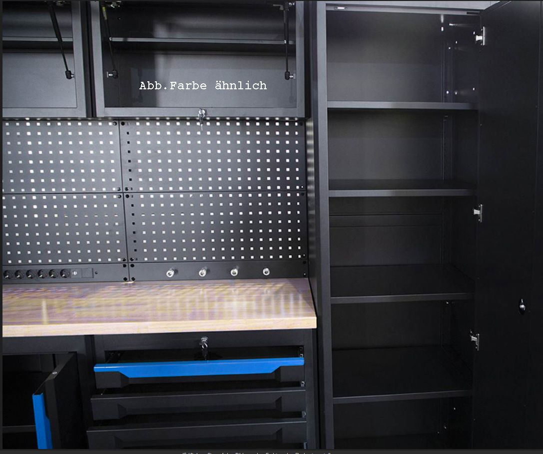 Dieses Werkstattsystem kombiniert Robustheit, Sicherheit und Funktionalität mit einem ansprechenden Design. Die abschließbaren Schränke und die integrierte Stromversorgung machen es zu einer praktischen All-in-One-Lösung für jeden Arbeitsbereich.