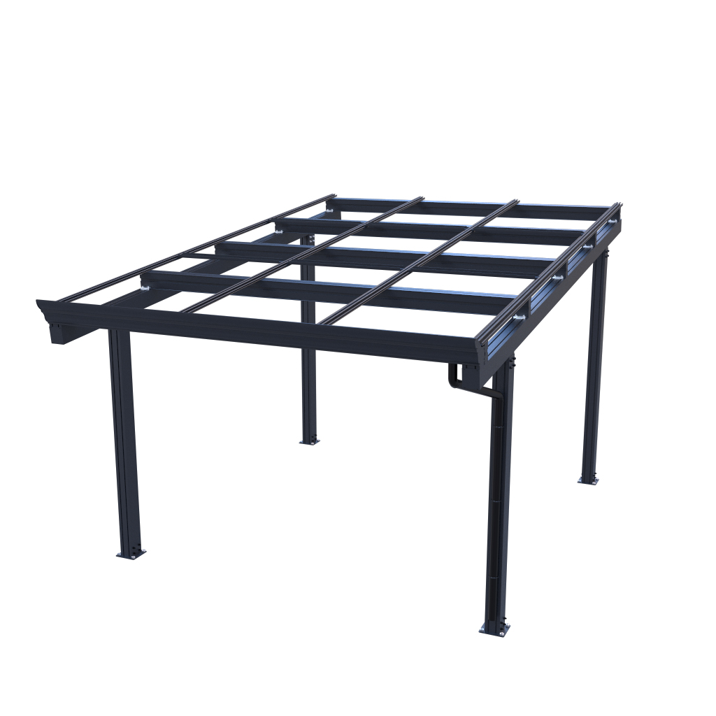 Das Carport besteht aus einer Aluminiumrahmenstruktur mit vier offenen Seiten und einem leicht geneigtem Dach, das mit Solarzellen versehen werden kann.