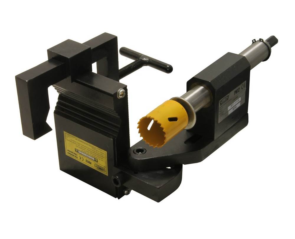 Er lässt sich leicht auf einem Arbeitstisch und insbesondere auf Bohrmaschinen montieren. Diese Radius-Säge kann mit einer normalen Handbohrmaschine und Standard-Bi-Metall-Lochsägen verwendet werden. Einfach auf einer Werkbank oder in einem Schraubstock zu montieren.