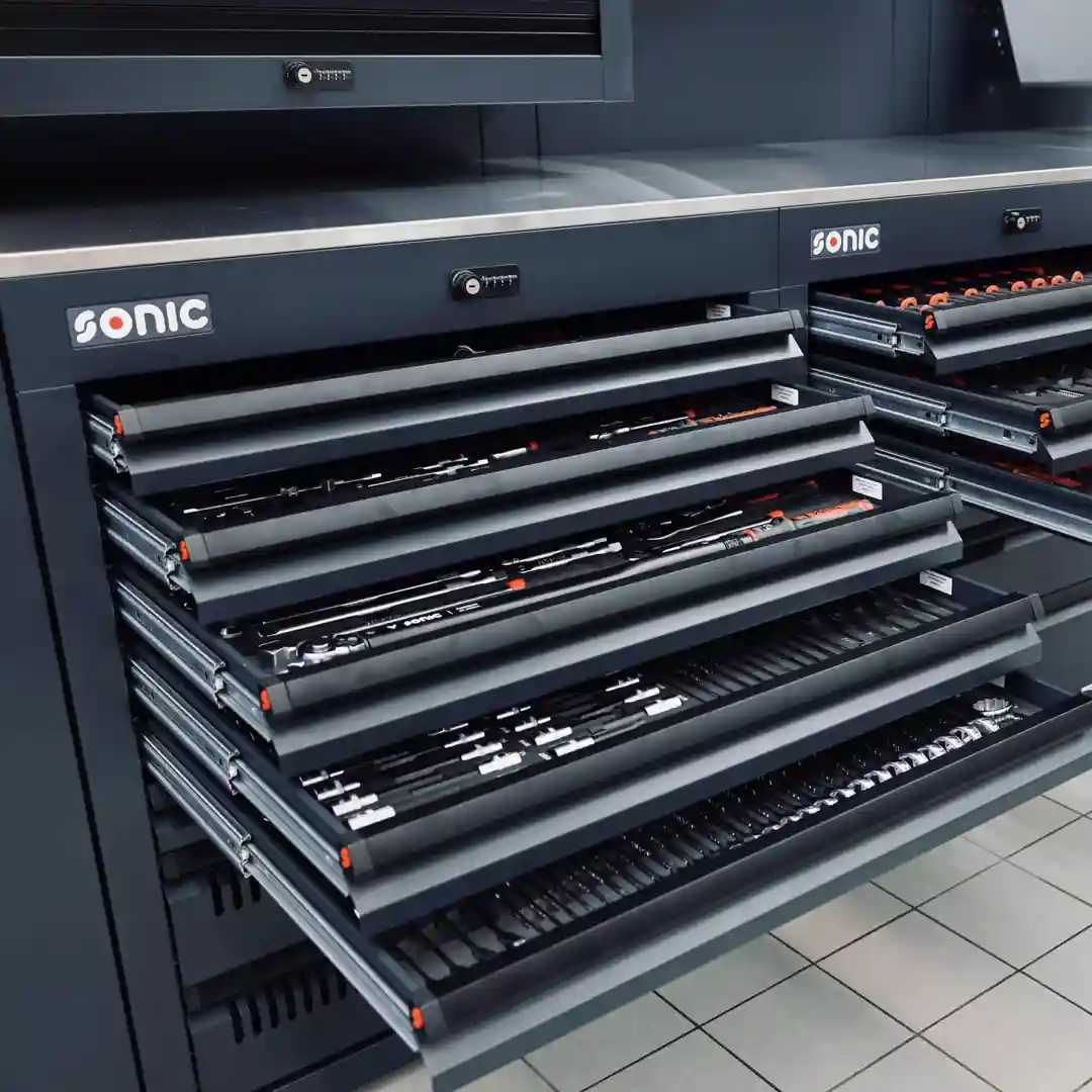Der Sonic NEXT S9 Werkstattwagen ist die ideale Lösung für professionelle Mechaniker und ambitionierte Schrauber, die einen umfassenden und gleichzeitig platzsparenden Werkzeugsatz benötigen. Mit seinen kompakten Maßen, einer cleveren Stauraumaufteilung und seiner hohen Belastbarkeit gehört er zu den beliebtesten und meistempfohlenen Werkstattwagen im Sortiment.