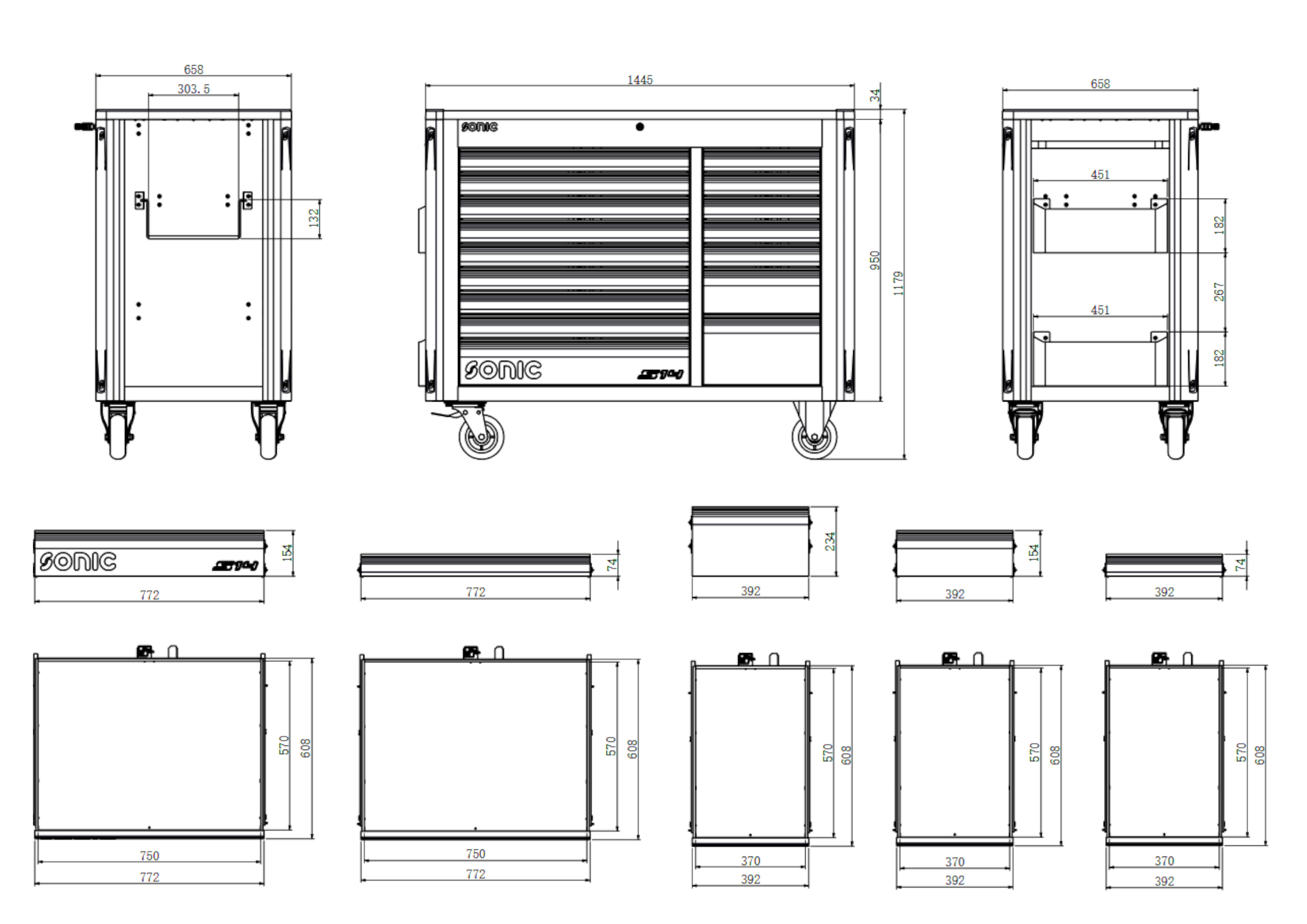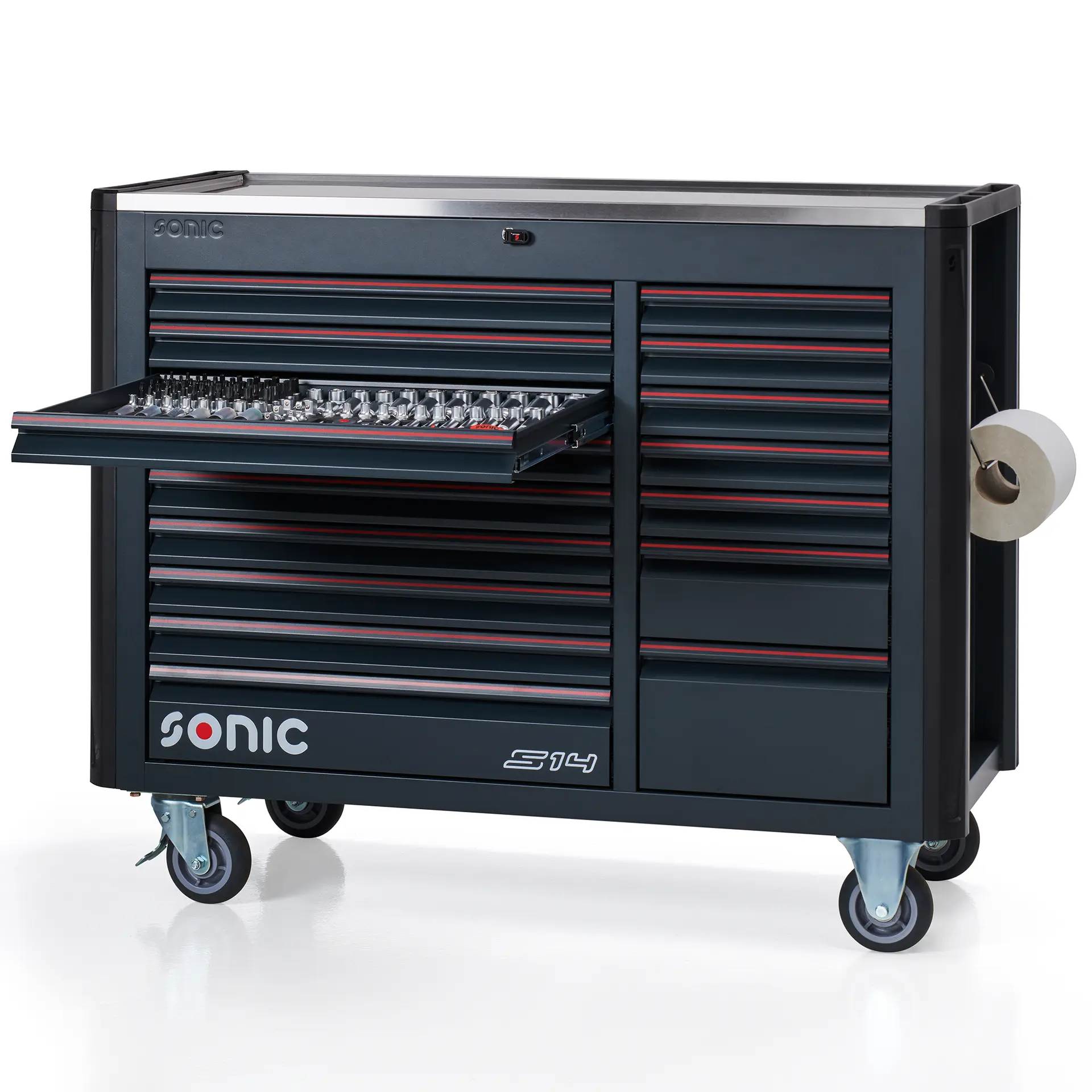 Der Sonic NEXT S14 Werkstattwagen ist Teil unseres Spitzensortiments für Mechaniker, die nach einem fortschrittlichen und Experten Werkzeugsatz suchen. Dieser Werkstattwagen ist einer unserer größten fahrbaren Aufbewahrungsschränke. Mit einer Breite von 145cm und einer Tiefe von 65cm ist der NEXT S14 ein großartiger Kauf für einen Werkstattwagen, der eine höhere Arbeitsfläche und gleichzeitig mehr Stauraum bietet.