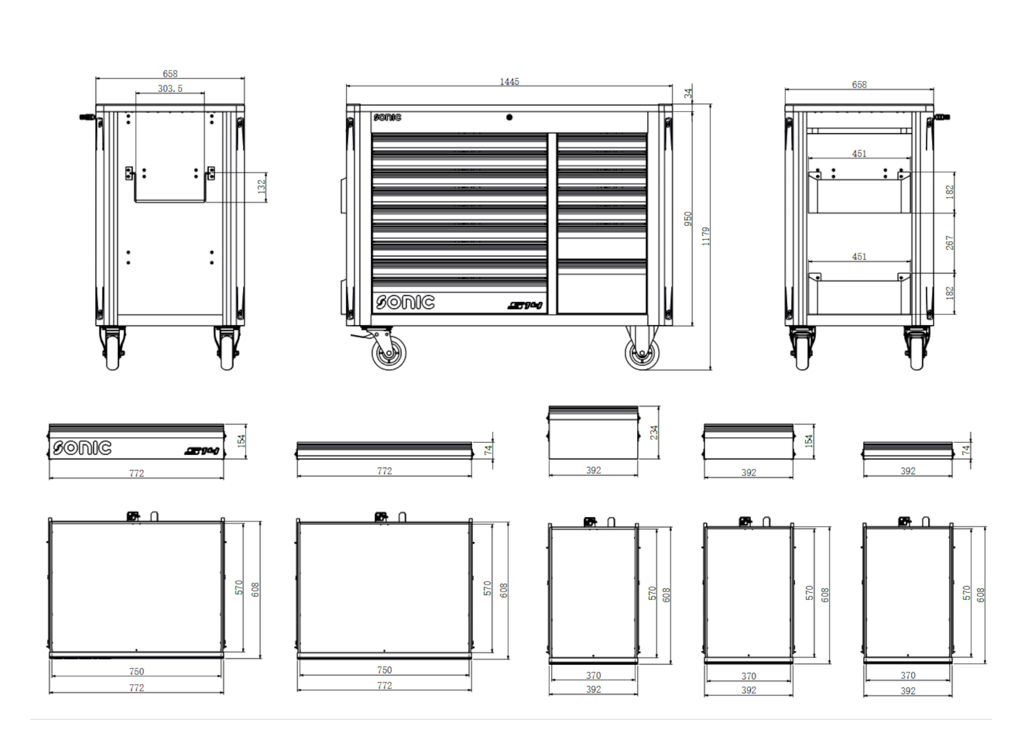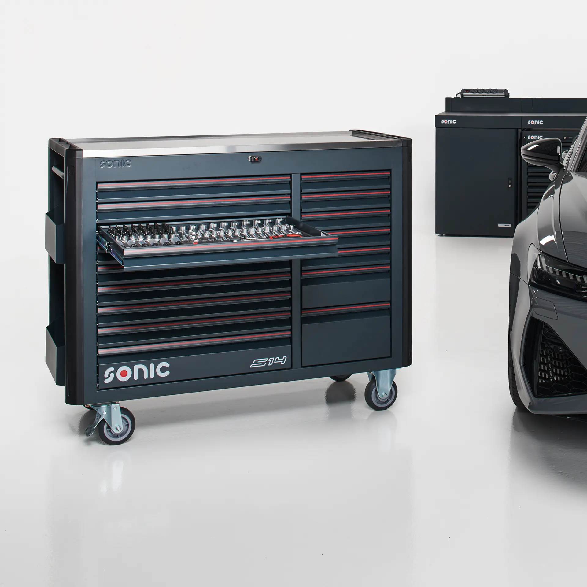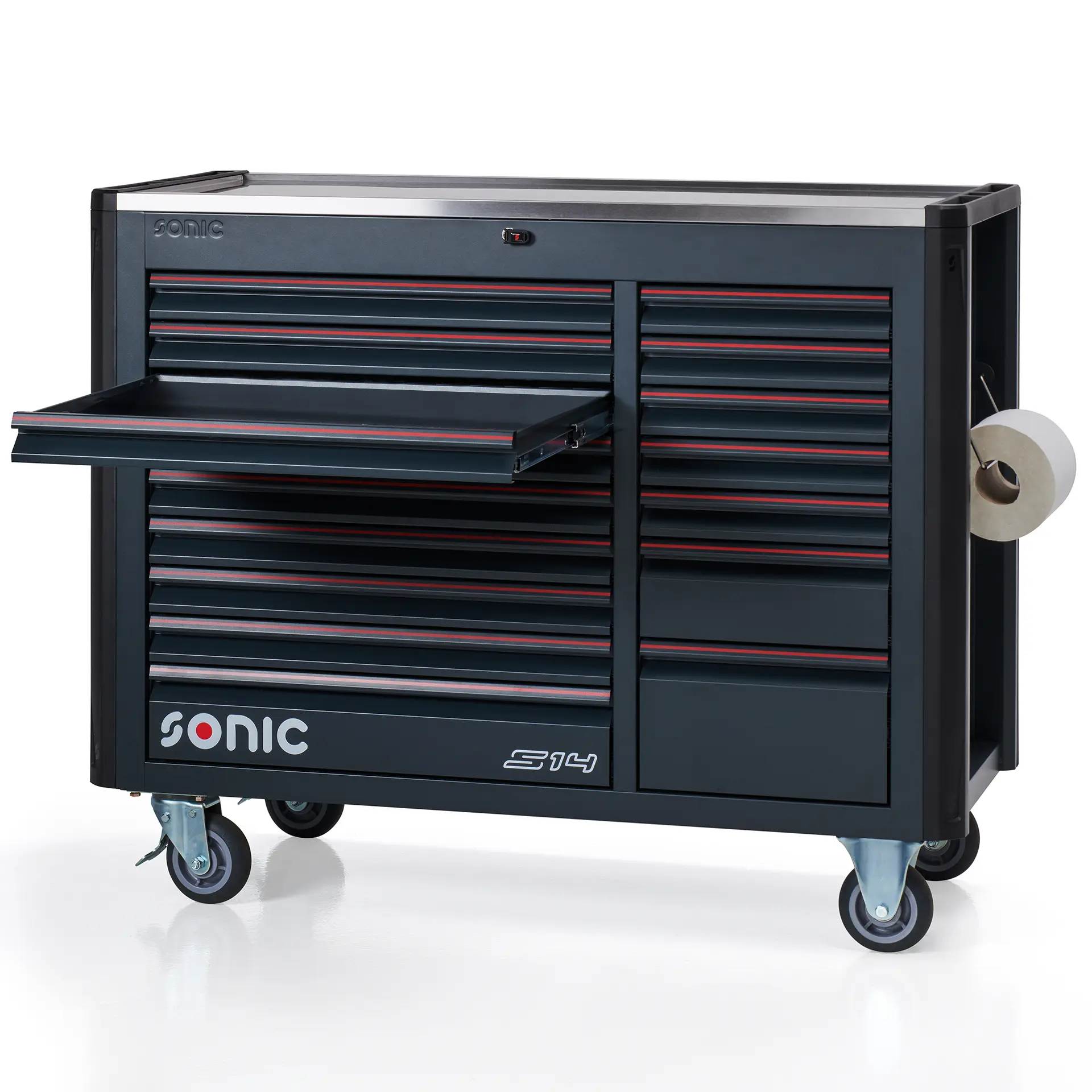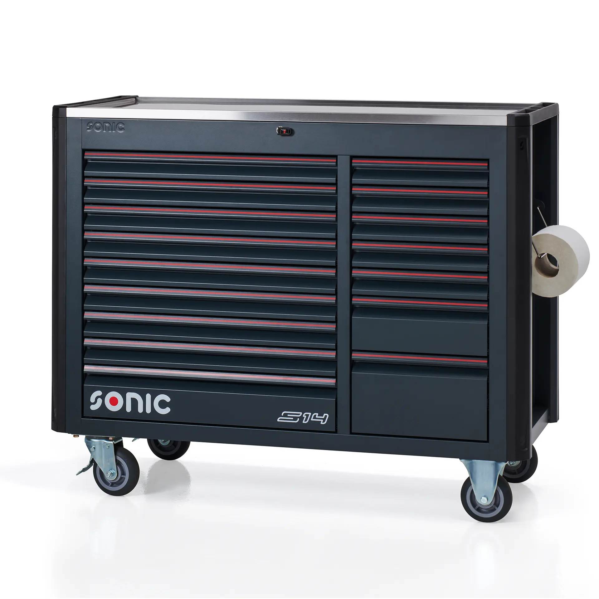 Der Sonic NEXT S14 Werkstattwagen ist Teil unseres Spitzensortiments für Mechaniker, die nach einem fortschrittlichen und Experten Werkzeugsatz suchen. Dieser Werkstattwagen ist einer unserer größten fahrbaren Aufbewahrungsschränke. Mit einer Breite von 145cm und einer Tiefe von 65cm ist der NEXT S14 ein großartiger Kauf für einen Werkstattwagen, der eine höhere Arbeitsfläche und gleichzeitig mehr Stauraum bietet.