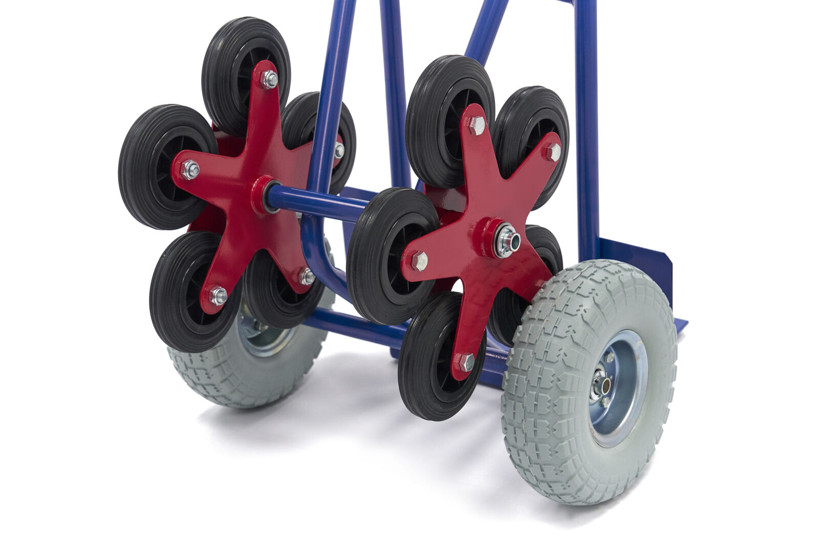 Ein Umzug ist ein harter Job, besonders wenn man Kisten und Gegenstände die Treppe hinauf oder hinuntertragen muss, weil es keinen Aufzug gibt. Dieser Treppenstapler ist genau für diesen Zweck konzipiert. Dank der 2 Luftreifen und der 10 Hartgummiräder, die an fünfarmigen Radsternen befestigt sind, können Sie Lasten bis zu 300 kg, problemlos über die Treppe transportieren. Der Wagen ist mit speziellen Sicherheitshandgriffen ausgestattet, sodass Sie ihn leicht im Griff behalten können. Der Wagen hat eine robuste Pulverbeschichtung und insgesamt zehn hochwertige Gummiräder. An der Oberseite des Rahmens befindet sich ein Knick, um auch bei großen Lasten einen guten Halt auf dem Wagen zu haben.